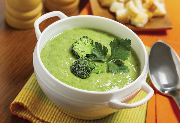 Add the broccoli stalks and continue to cook until all the vegetables are just tender. Remove from heat and allow to cool slightly before blending to a smooth pure purée. Add a dab of sour cream and a few sprigs of herb if you wish.