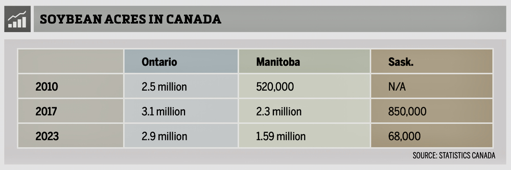Manitoba’s soybean acreage reached a peak of 2.3 million in 2017. That same year, Saskatchewan farmers seeded around 800,000 acres of the crop. Acreage was expected to climb, possibly hitting three million in Manitoba and several million in Saskatchewan.