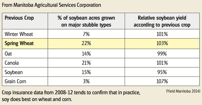 At Carman in 2013, it yielded 65 bushels per acre compared to 53 on corn and 52 on wheat. But at Kelburn in 2014, soy on soy yielded only 36 bushels versus 45 on corn and 47 on wheat.