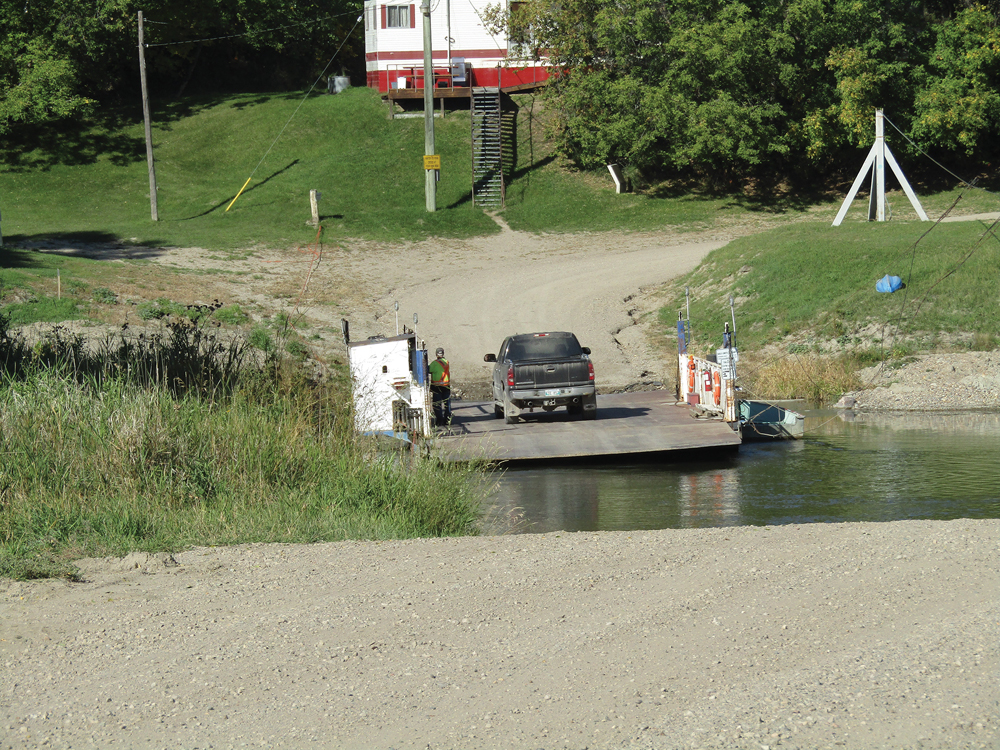 The ride across is short, so if you want photos, be ready to start as soon as you drive on. Last fall the river was quite shallow, but this summer ferry operation did not begin until the first week of August due to high water conditions on the Assiniboine. In some years the site is also used as an access spot for river canoeists.