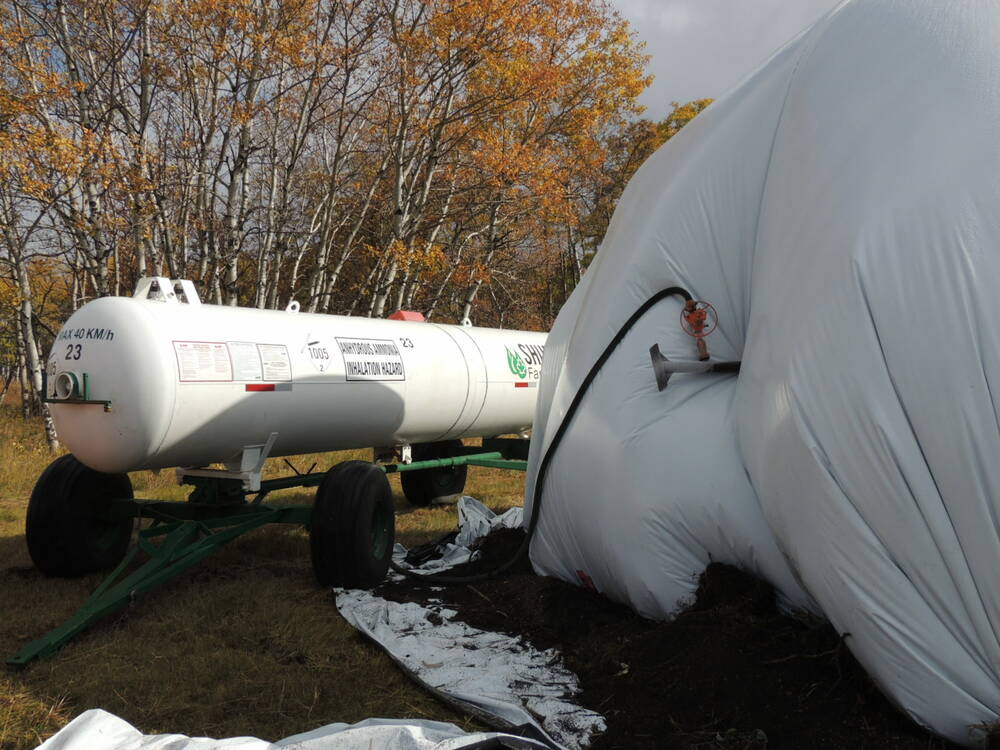 On Oct. 9, Manitoba Agriculture held a forage ammoniation workshop at the Manitoba Beef & Forage Initiatives (MBFI) Brookdale farm. Interested producers gathered to hear how to safely handle anhydrous ammonia and how it can benefit their damp hay or improve the feeding value of their low quality forages.