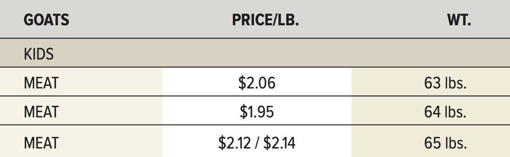 The feeder lambs were represented by a group of seven 81-pound Cheviot-cross lambs, bringing $160.38 ($1.98/lb.). An 80-pound Suffolk-cross lamb brought $145.60 ($1.82/lb.).