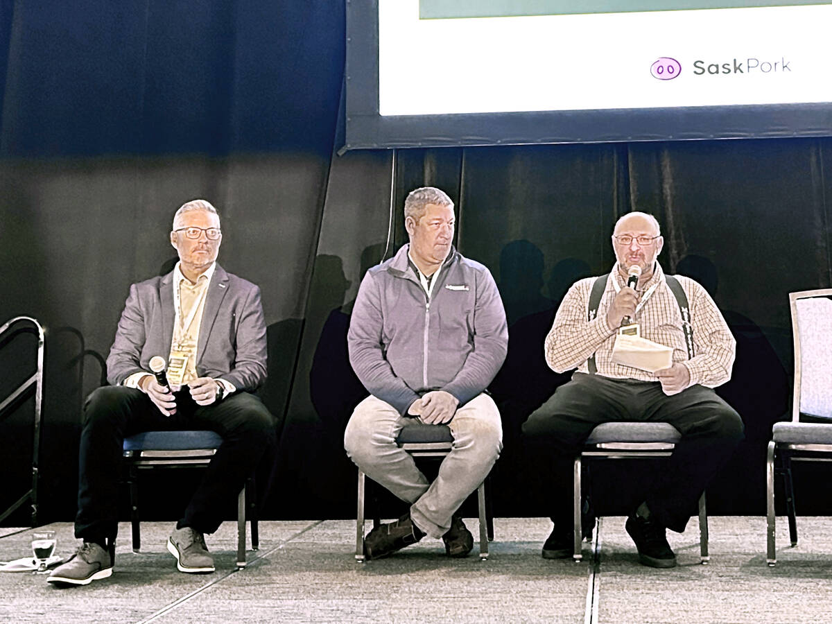 Daryl Possberg, Levi Soltys, Toby Tschetter during the Group Sow Housing and Renovations panel at the 2025 SaskPork Symposium. Photo: Janelle Rudolph