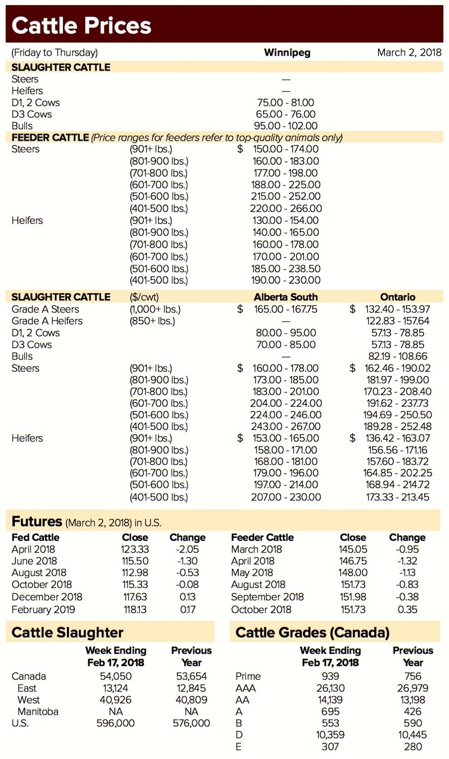 Some weakness could come the next week or two, as U.S. futures have been weakening recently. April-dated contracts fell 4.5 per cent on the Chicago Mercantile Exchange last week due to supply issues in the U.S. There are fears that the U.S. supply of cattle is rising too quickly and the pressure could be felt into summer.