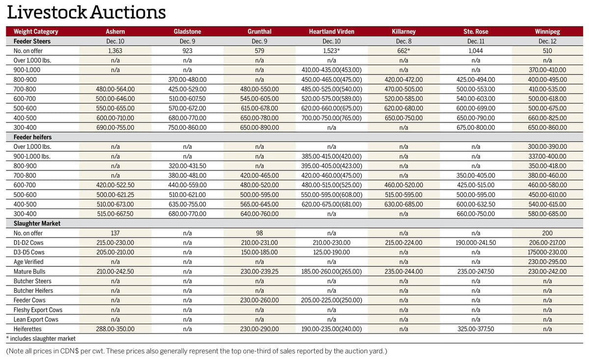 All seven of Manitoba’s major livestock auction marts had sales the week of Dec. 8-12, 2025. Here are the prices Manitoba farmers were getting for their cattle at Killarney, Ste. Rose, Winnipeg, Virden, Grunthal, Gladstone and Ashern.