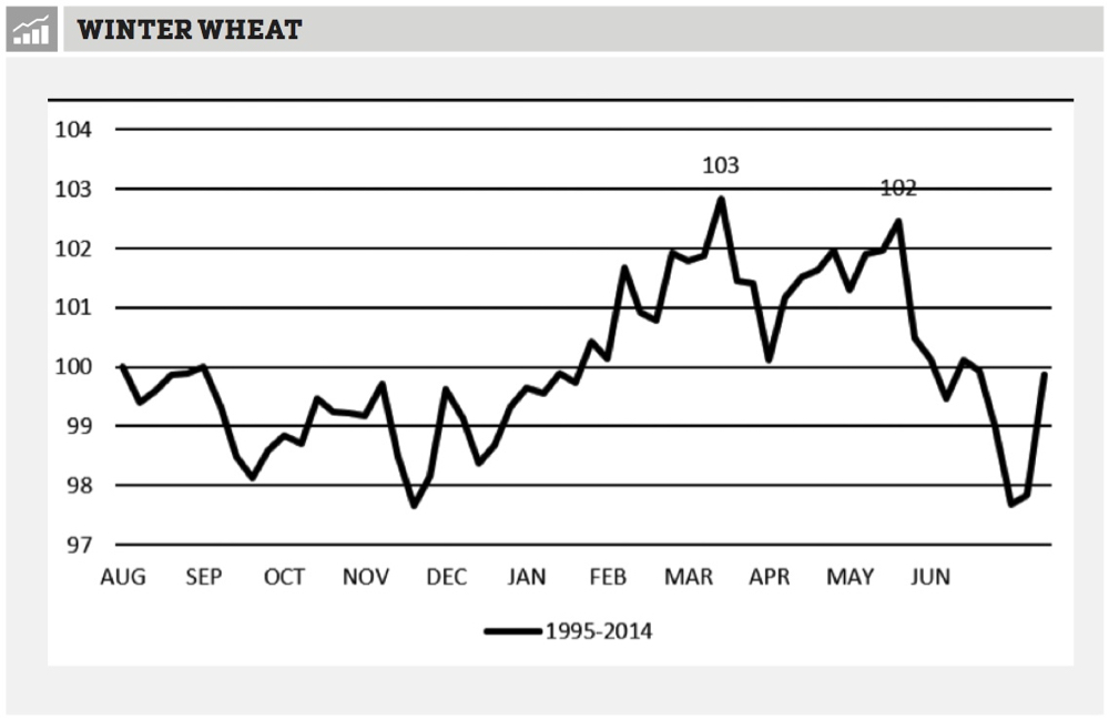 Finally, we have wheat. “Winter wheat presents a unique pattern. The new-crop winter wheat contract remains relatively low from August until the end of January, during the planting and dormant season for the crop. The July new contract slowly increases from January until it peaks in March as the bulk of moisture is provided to the crop through late-winter and early-spring precipitation. There is some volatility in the price pattern during the heading stage of the crop with a rapid drop in April and recovery in May. After May, the price gradually decreases as the July contract approaches expiration. March and May provide the best probability for pre-harvest marketing winter wheat at peak prices of the July Kansas City contract.”
