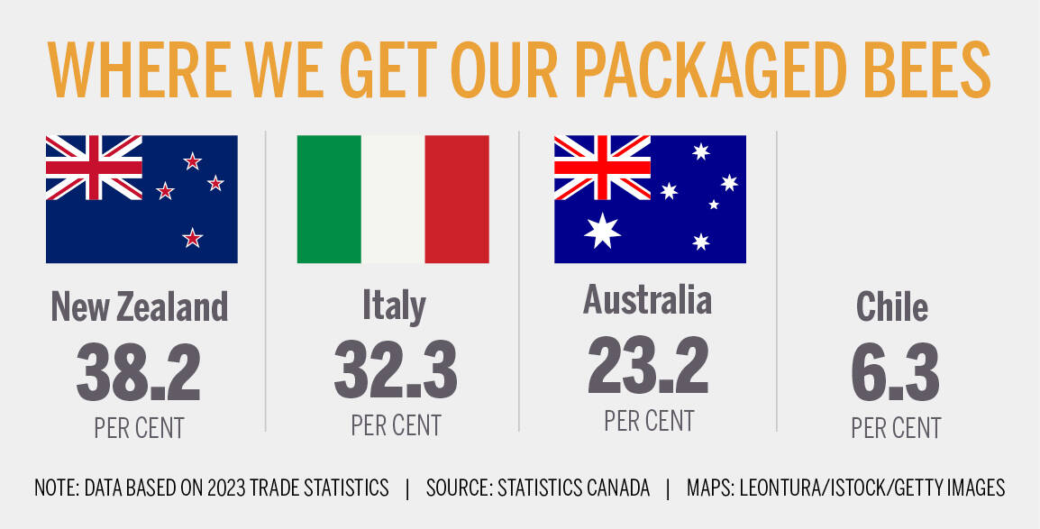 Package bees from the U.S. have been blocked from Canada since the 1980s, and a 2022 report from Agriculture and Agri-Food Canada (AAFC) notes that since 2017, package honeybee imports have come exclusively from Australia, New Zealand, and Chile.