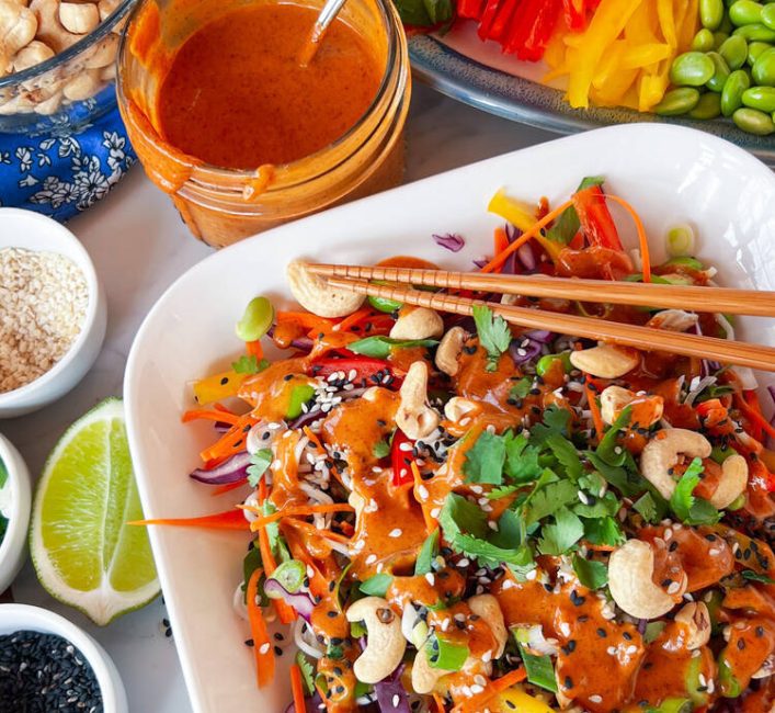 Feast with your eyes and with your taste buds. This power bowl features a tasty almond butter and red curry paste dressing.