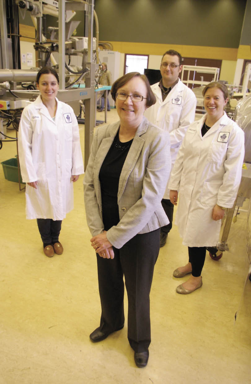 Linda Malcolmson, Cigi’s manager of special crops, oilseeds and pulses says the establishment of a pulse-processing facility and the skilled team operating it is one of the things she’s most proud of from her time at Cigi. That team includes technologist (l) Gina Boux, and project managers Peter Frolich and Heather Maskus. Lindsay Bourre, a technical specialist (not pictured) is also part of Cigi’s pulse team. Photo: Lorraine Stevenson