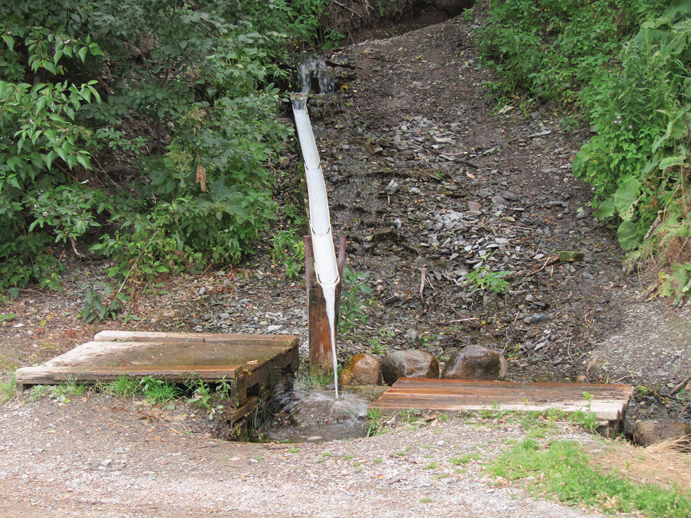 To view the springs that contribute water to this spot, take the road around the curve to the west of the entrance. The water issues from the bank into a rain gutter and under the road. The road here can become icy in winter as the spring continues to run.