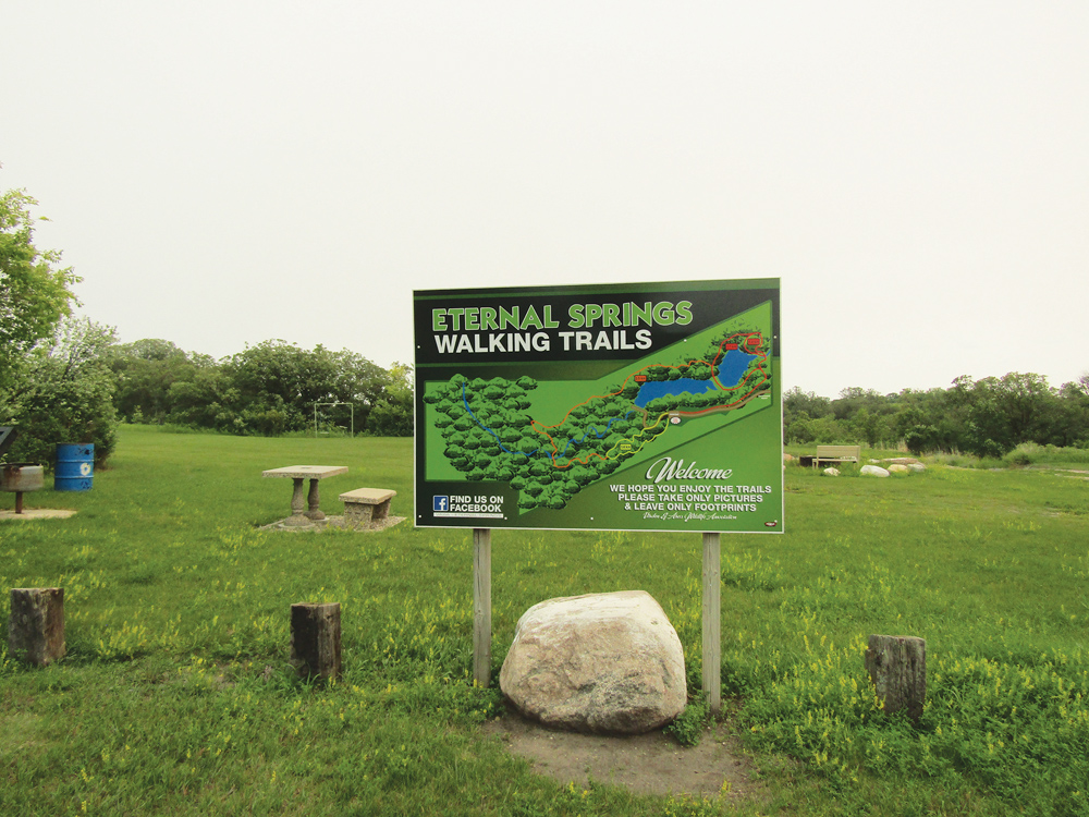 Driving directions: From the west entrance to Oak Lake, take Highway 254 and drive north for 6.5 kilometres (four miles) to road 56N. This will take you through the scenic Assiniboine Valley, which is worth a trip itself. Drive 1.5 km west on 56N to 141 W, then 1.5 km north and then 4.5 km west. A sign on the left (south) indicates Eternal Springs.