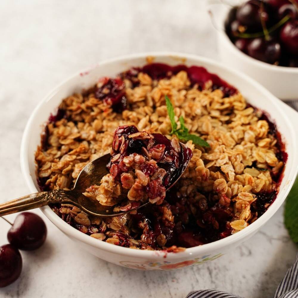 - Sprinkle over fruit and bake for 40-45 minutes. The filling should be bubbling and the top should start to turn golden brown.