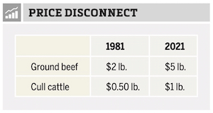 Based on StatCan and Agriculture and Agri-Food Canada data, ground beef rose to between $5 and $6 per pound in 2021 from just under $2 per pound in 1981 while the price of cattle (cull cows, liveweight, in Alberta) rose to about $1/lb. from $0.50/lb. in the same time frame.