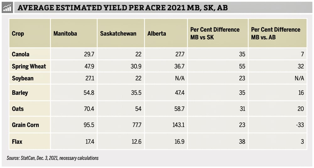 The report also shows most Manitoba yields in 2021 were above those in Saskatchewan and Alberta (see below).