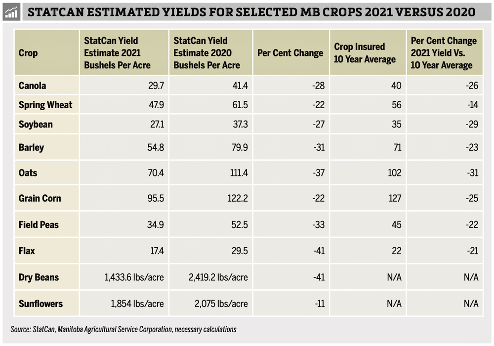 StatCan put average Manitoba spring wheat and canola yields at 47.9 and 27.9 bushels an acre down 22 and 28 per cent, respectively from 2020 and 14 and 26 lower than the 10-year crop insured average (see below).