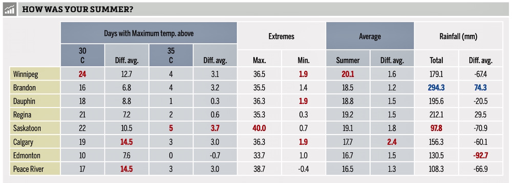 The maximum summer temperatures across the Prairies were very warm, with an impressive 40 C in Saskatoon. The coldest temperatures, or minimum temperatures in the summer, were not surprisingly cool. Don’t forget that June is part of the summer, and it began on the cool side before the heat finally moved in. It is also not surprising that Peace River had the coolest temperature, simply due to its more northerly location, but it also had the second-warmest temperature of the summer.