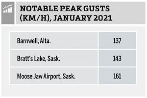 Just a few weeks before this, after a fairly quiet winter, an intense storm system brought rain, freezing rain, and then snow and blowing snow to a large area of Alberta and Saskatchewan. While the storm didn’t produce huge amounts of snow, it did pack wind gusts in excess of 100 km/h which were reported at over 74 weather stations, including those seen in the table.