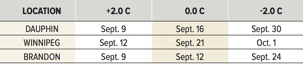 The first question I’m usually asked about fall frost is when the different areas of agricultural Manitoba should expect to receive their first fall frost. To analyze this, we must first determine how frost is to be measured or recorded. The typical measurement we use to record whether or not frost has occurred is when the temperature recorded by a thermometer hits or falls below 0 C. As some of us have already had the unfortunate first-hand opportunity to realize, frost can occur even when the thermometer shows temperatures above the freezing mark. In fact, research has shown ground-level frost can occur at thermometer readings as high as +2 C, and in some cases, as high as +5 C! This can occur for a number of reasons, which largely depend on where the thermometer is located. As most thermometers are placed above the ground, they record air temperature several feet above the ground and may not accurately reflect actual ground temperature.